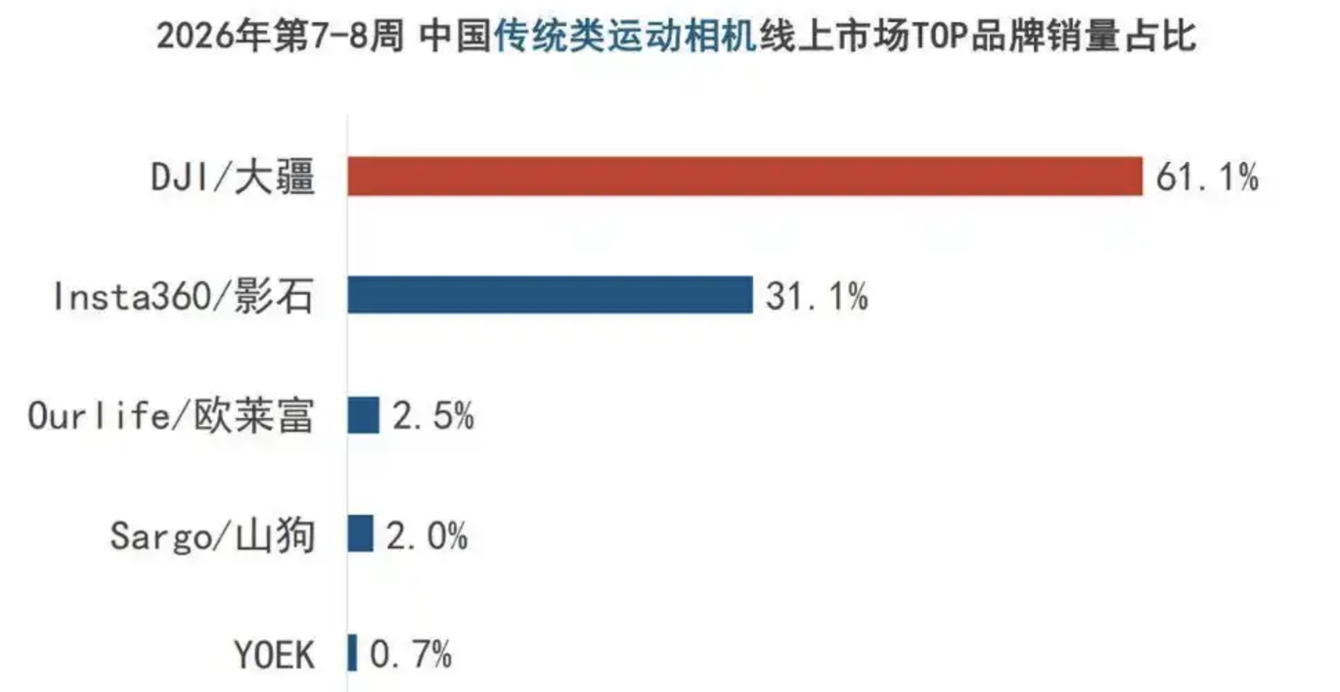 洛圖科技發(fā)布的《中國運動相機線上零售市場周度追蹤》報告顯示,2026年春節(jié)假期期間(2月9日至2月22日),中國泛運動相機市場(涵蓋全景相機、可穿戴設(shè)備等)迎來顯著增長。線上零售總銷量為9.6萬臺,銷售額為2.3億元,平均售價約2401元。其中,大疆以62.9%的銷量份額穩(wěn)居榜首,Insta360影石緊隨其后,占比28.6%。當(dāng)下,運動相機正在深度融入大眾日常消費,在年終收入與節(jié)日預(yù)算支撐下,消費者的購買重心明顯向高品質(zhì)的創(chuàng)作工具傾斜。