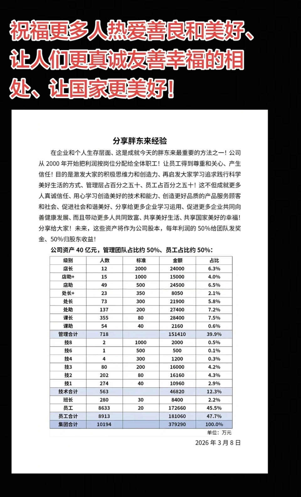 胖東來創(chuàng)始人于東來在社交平臺發(fā)文分享胖東來經驗,公布公司40億元資產利潤的分配標準:管理團隊占比約50%,員工占比約50%。未來,這些資產將作為公司股本,每年利潤的50%給團隊發(fā)獎金、50%歸股東收益。于東來表示,公司從2000年開始把利潤按崗位分配給全體職工,讓員工得到尊重和關心、產生信任,目的是激發(fā)大家的積極思維力和創(chuàng)造力,再啟發(fā)大家學習追求踐行科學美好生活的方式。