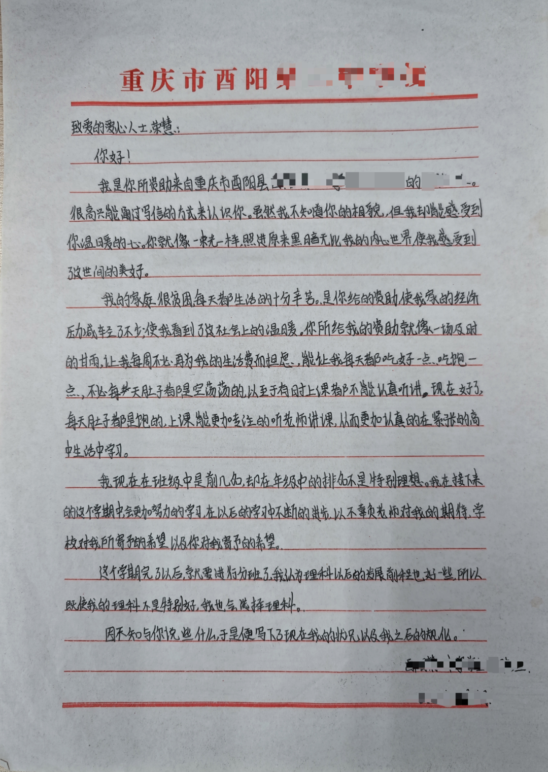 信中寫道:“敬愛的榮慧阿姨,我是酉陽某學(xué)校的學(xué)生,謝謝您的資助,我能繼續(xù)上學(xué),不用再餓著肚子聽課了。雖然沒見過您,但您像一束光,照亮了我灰暗的世界,讓我感受到了溫暖……”