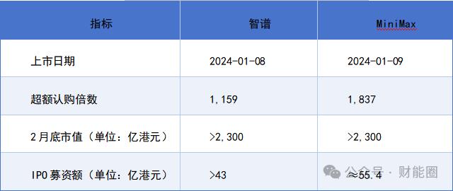 1月8日,智譜在港交所掛牌,成為“港股大模型第一股”,公開發(fā)售獲1159倍認(rèn)購(gòu)。次日MiniMax緊隨其后,超額認(rèn)購(gòu)1837倍。截至2月底,兩家公司股價(jià)漲幅均超360%,市值雙雙突破2300億港元。