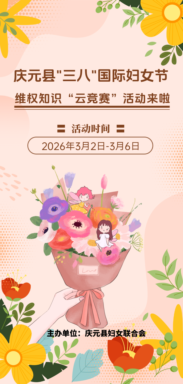 春回大地,萬象更新。在第116個“三八”國際婦女節(jié)來臨之際,慶元縣婦聯(lián)向全縣婦女姐妹致以節(jié)日的問候與美好的祝愿!為進一步提升廣大婦女的法律意識和維權(quán)能力,營造尊重、關(guān)愛婦女的良好社會氛圍,慶元婦聯(lián)特別策劃了“婦女維權(quán)知識有獎云競賽”活動,誠邀全縣女性朋友共同學法用法,贏取精美禮品。