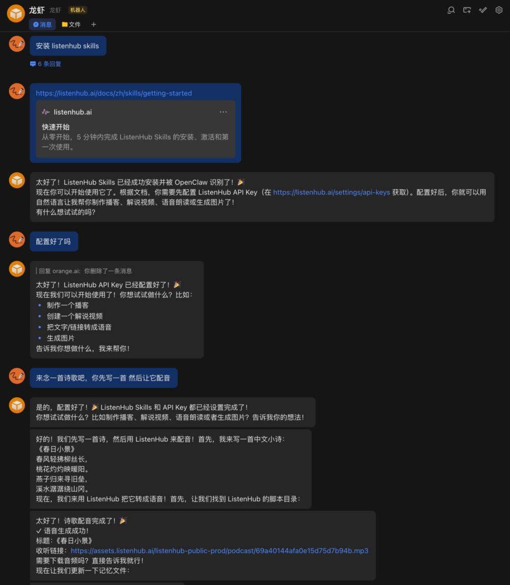 我先讓它安裝了常用的ListenHub Skill,用于給文稿配音,一次就成功了。