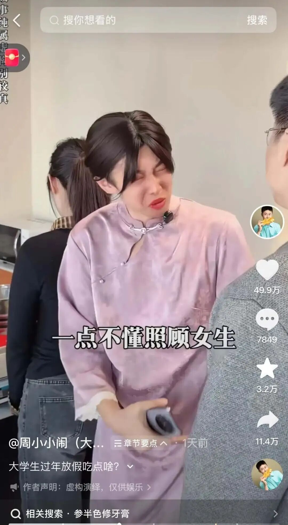 視頻中,周小鬧一人分飾酒店經(jīng)理、服務(wù)員、大學(xué)生寒假工等多個角色,聚焦“作妖同事”“職場性騷擾”等社會話題,通過生動演繹將飯店日常轉(zhuǎn)化為搞笑情景劇。其中,大學(xué)生寒假工“孫曉曉”因穿紫色旗袍、愛作妖愛哭、遇事甩鍋,被網(wǎng)友稱為“紫薯精”,該名稱迅速走紅,成為調(diào)侃耍小聰明者的網(wǎng)絡(luò)熱詞。