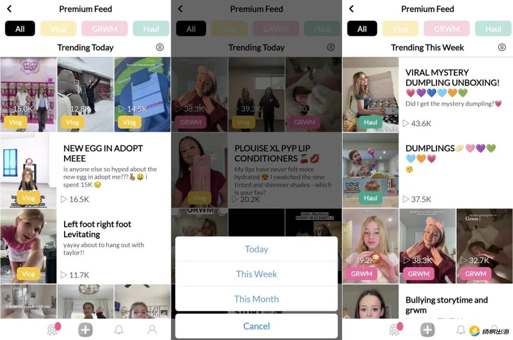 挑戰(zhàn)多為拍攝特定視頻,如用特定濾鏡、參與音樂節(jié)奏短片等,平臺會篩選“Top9”和“Poplar”視頻展示。這種設(shè)計將用戶注意力從刷內(nèi)容轉(zhuǎn)向主動創(chuàng)作。平臺還統(tǒng)計內(nèi)容熱度與標(biāo)簽分類,用戶可在首頁查看當(dāng)日、本周、本月流行趨勢,或按Vlog、GRWM、Haul等標(biāo)簽篩選內(nèi)容。