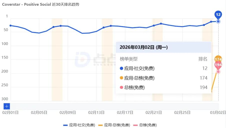 在此背景下,強調(diào)內(nèi)容安全、積極氛圍與可控互動的社交產(chǎn)品逐漸受關(guān)注。點點數(shù)據(jù)顯示,2017年上線的Coverstar于2026年3月2日登上美國App Store社交類免費榜第12名,并在英國、瑞士、瑞典等歐洲國家進(jìn)入社交類免費榜前十。