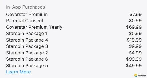 應(yīng)用內(nèi)購買包括Starcoins虛擬貨幣(0.99-99.99美元)和Coverstar Premium訂閱服務(wù)。Starcoins可用于送虛擬禮物、加成曝光、解鎖視覺效果,形式類似直播禮物經(jīng)濟(jì),但付費更多是鼓勵支持,因未成年人家長限制內(nèi)購,未形成穩(wěn)定付費閉環(huán)。