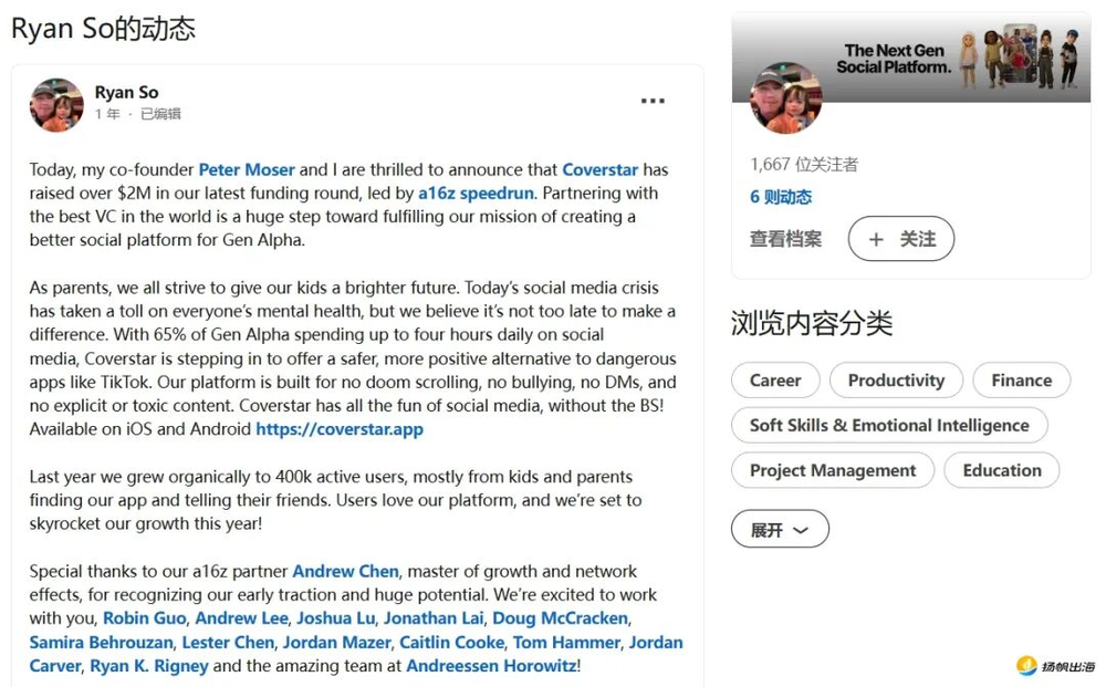 2025年,Coverstar首席執(zhí)行官Ryan So通過LinkedIn宣布,平臺獲a16z Speedrun領(lǐng)投的超200萬美元融資。他提到,65%的Alpha世代每日花4小時在社交媒體,平臺目標(biāo)是“為Alpha世代打造更優(yōu)質(zhì)的社交平臺”。