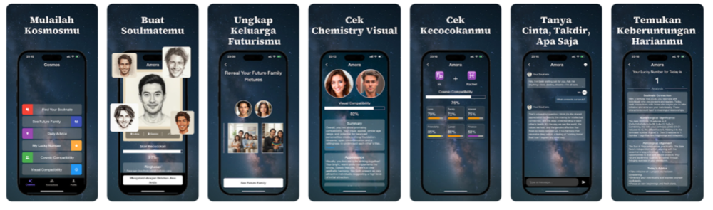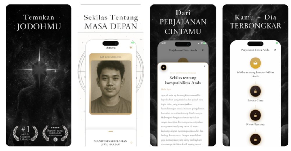 但社媒內(nèi)容顯示,多數(shù)相關(guān)內(nèi)容呈現(xiàn)的是流水較高的「Amora:Belahan jiwa kamu」界面,語言以印尼語、越南語為主,少量西語和葡語,形式更像Web端占星產(chǎn)品Hint,而非Starla,核心是讓用戶相信用Amora能找到Soulmate(關(guān)于Hint可參閱《借移動端的“涼梗”流量增長150%,這家AI占星網(wǎng)站一年收入過千萬》)。
