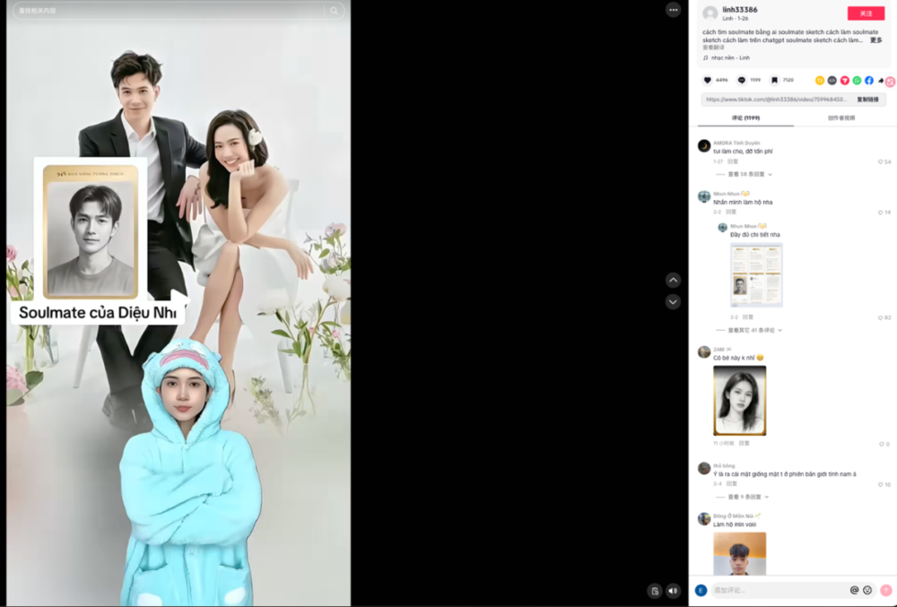 TikTok上,Amora相關(guān)內(nèi)容多為“真人出鏡+Soulmate+關(guān)系驗(yàn)證”模式。如上圖標(biāo)注女生與對應(yīng)男Soulmate,并配結(jié)婚照,文案直白“這是我的Soulmate”,強(qiáng)烈暗示Soulmate“照進(jìn)現(xiàn)實(shí)”。