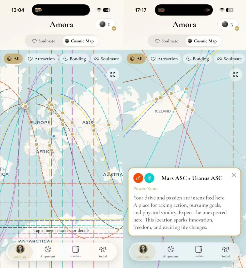 看到畫像后,用戶自然關(guān)心去哪里找,一級標(biāo)簽Soulmate下的二級標(biāo)簽Cosmic Map負(fù)責(zé)解答。依據(jù)占星地理學(xué)(Astro cartography),App提供Attraction(吸引)、Bonding(結(jié)合)、Soulmate(靈魂伴侶)、Luck(運(yùn)氣)等親密關(guān)系相關(guān)能量線,交匯點(diǎn)被定義為Soulmate可能出現(xiàn)的地點(diǎn),點(diǎn)擊后彈出卡片解讀該地點(diǎn)能量場變化及對找Soulmate的意義。