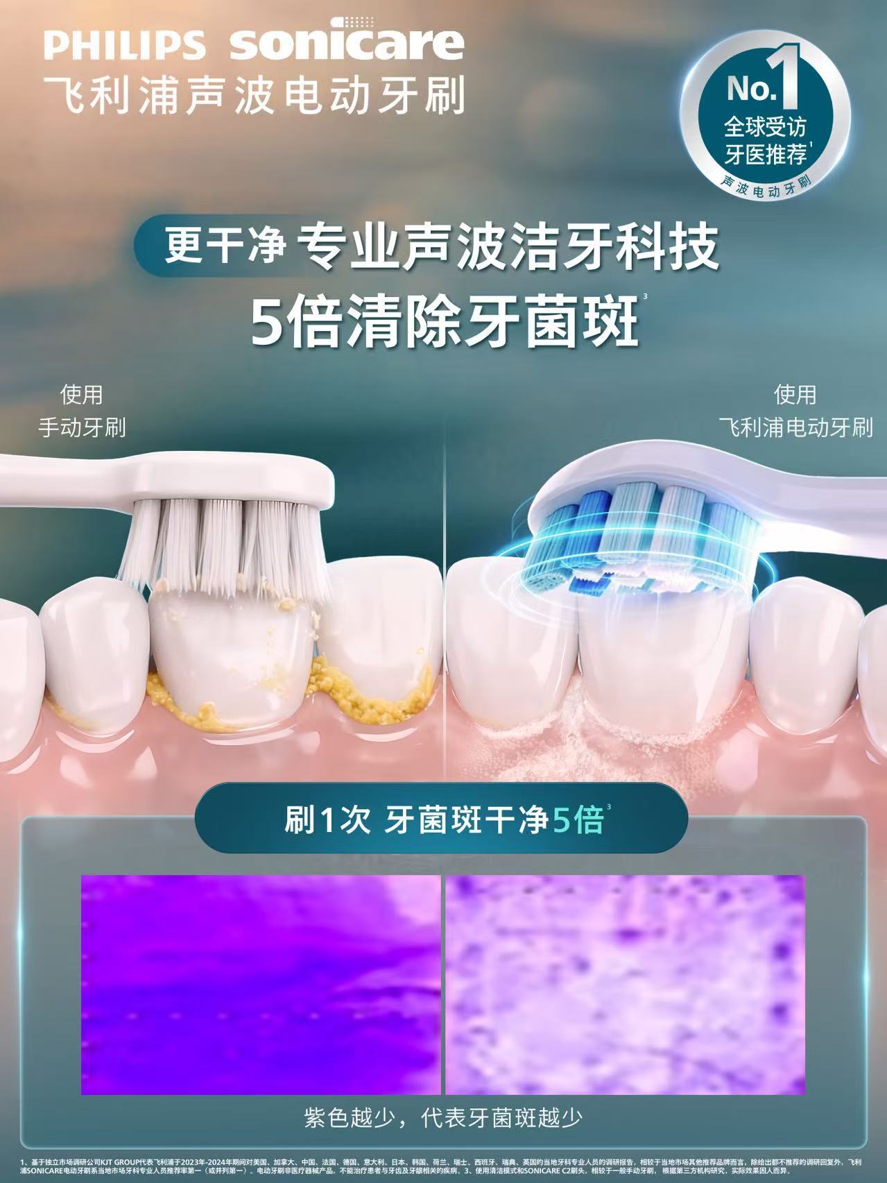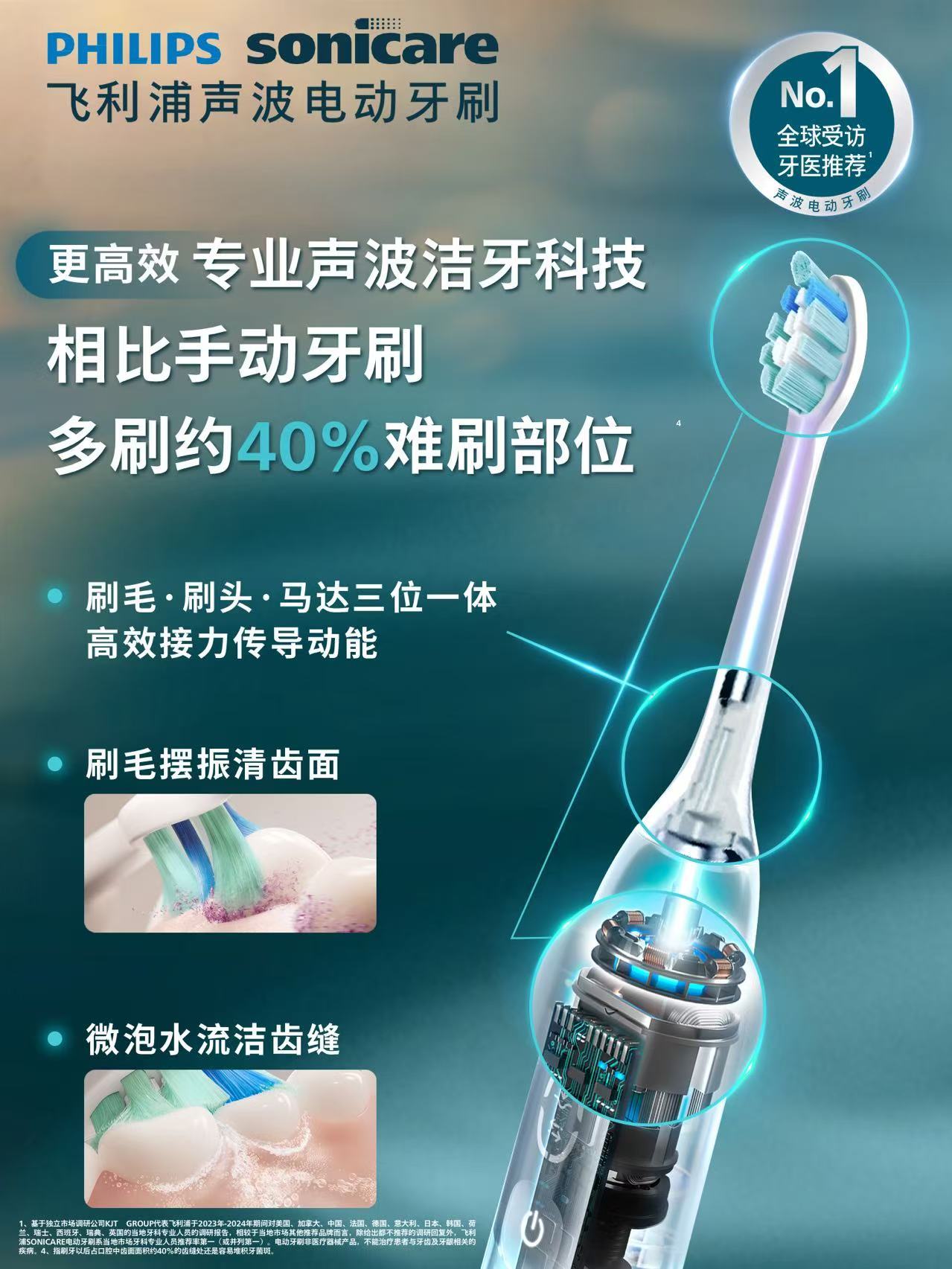 更高效!依托飛利浦33年的專業(yè)聲波潔牙科技,通過“刷毛-刷頭-馬達(dá)”三位一體的高效動(dòng)能傳導(dǎo),2分鐘內(nèi)可多刷約40%的難刷部位。