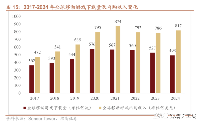 2020年全球手游雙平臺下載量達到576億次峰值后,連續(xù)四年下滑,2024年降至493億次。新增流量驅(qū)動增長的模式逐漸失效,拉新成本大幅上升。