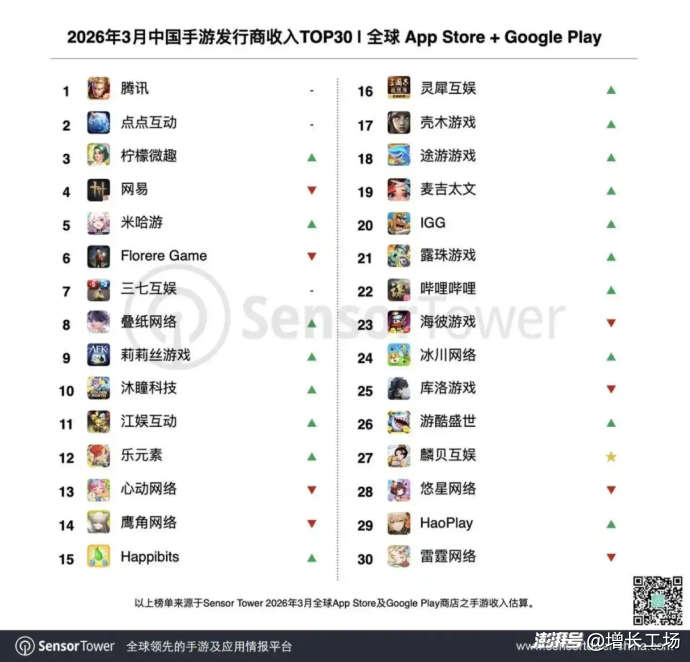 3月三七互娛收入環(huán)比上漲28%,位列全球第7?!禠ast Asylum: Plague》憑借新穎題材和副玩法,收入暴漲近11倍,成為2026年全球化現(xiàn)象級產(chǎn)品。