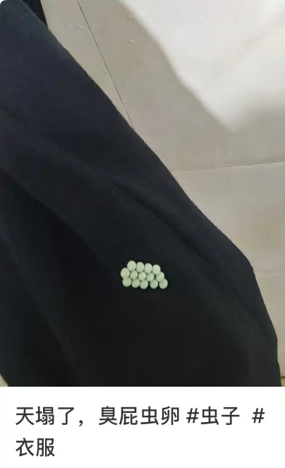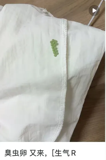天氣逐漸轉(zhuǎn)暖,不少網(wǎng)友和市民在晾曬的衣物上發(fā)現(xiàn)了圓圓的綠色小顆粒,一查才知道這是“臭屁蟲”的卵,有網(wǎng)友看到后直呼“天塌了”。