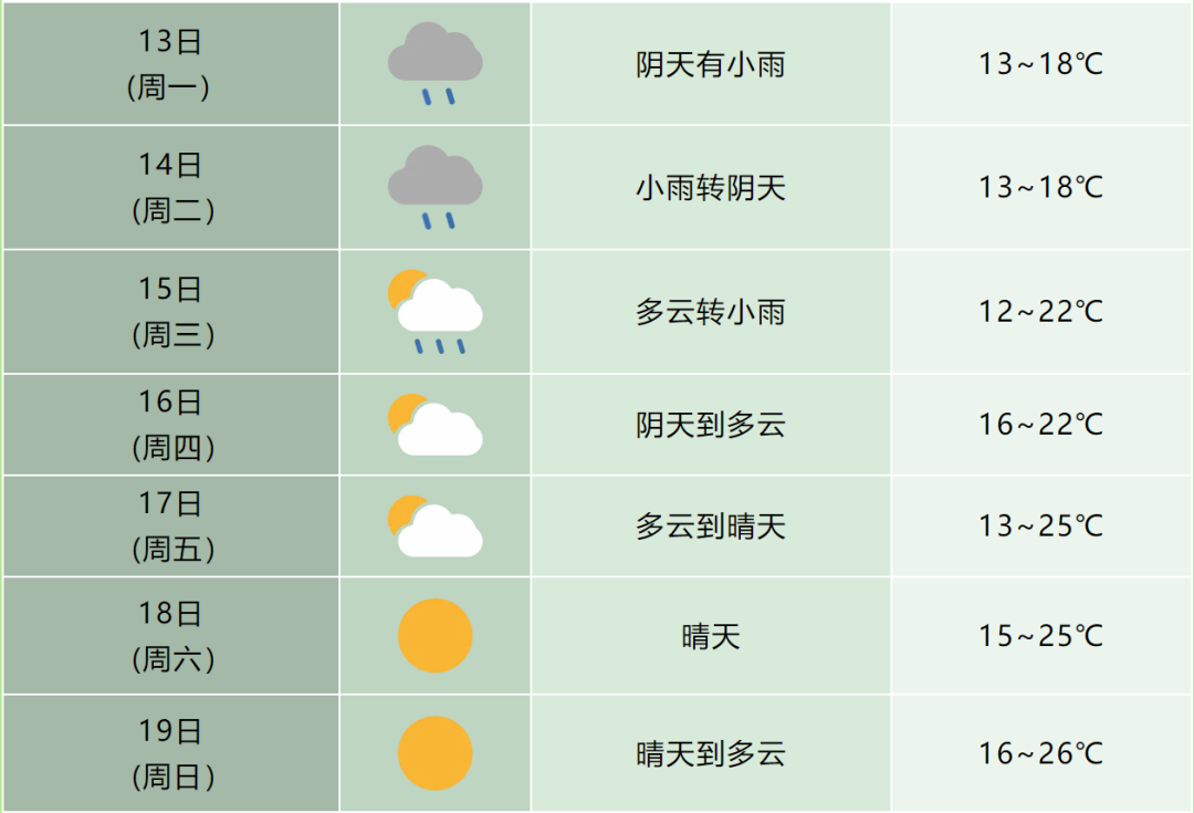 13日(周一):全省為陰天,大部分地區(qū)有小雨,沿江江南部分區(qū)域有中雨。