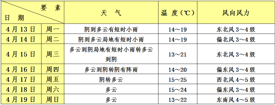 今日(13日)陰到多云,伴有短時小雨,白天最高氣溫約19℃,東北風3~4級,相對濕度在70%~95%之間,體感略顯濕涼。