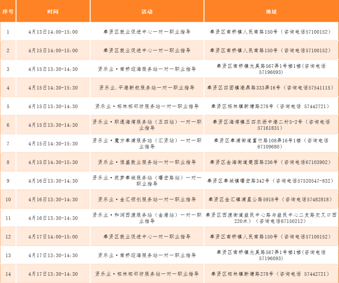 奉賢區(qū)“15分鐘就業(yè)服務(wù)圈”本周站點(diǎn)活動(dòng)安排