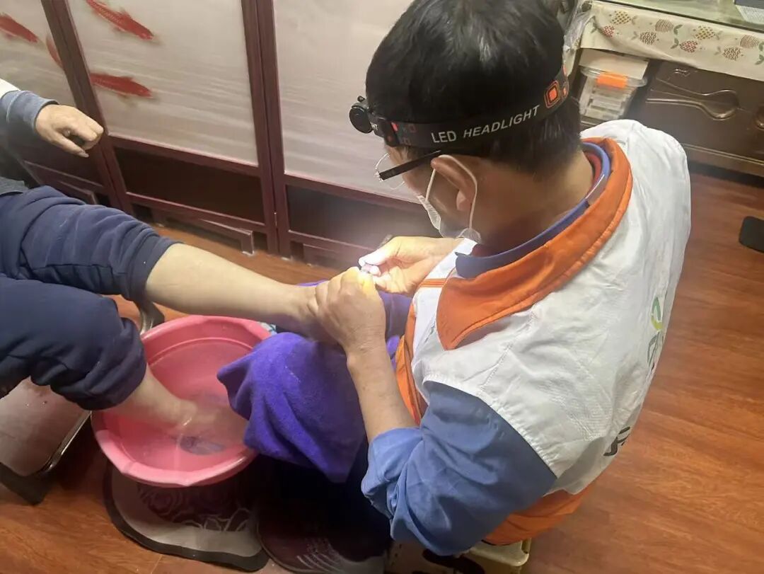 初春的陽光透過窗欞,灑進(jìn)楊浦區(qū)長白新村街道一戶老人的臥房。戴著專業(yè)頭燈的修腳師傅,正用溫水為90歲高齡的老人泡腳,嫻熟地用銼刀層層打磨掉老人腳趾上厚厚的灰指甲與老繭。這看似不起眼的“腳底板”小事,卻是許多高齡老人居家養(yǎng)老中難以解決的“痛點”。