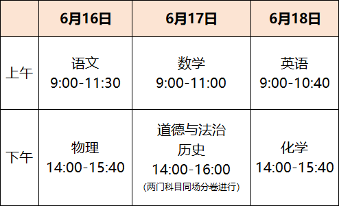 文化科目考試于6月16日至18日開展,各科目用時為:語文150分鐘、數(shù)學(xué)120分鐘、英語100分鐘、物理100分鐘、化學(xué)100分鐘,道德與法治和歷史合計120分鐘。具體日程安排見下圖: