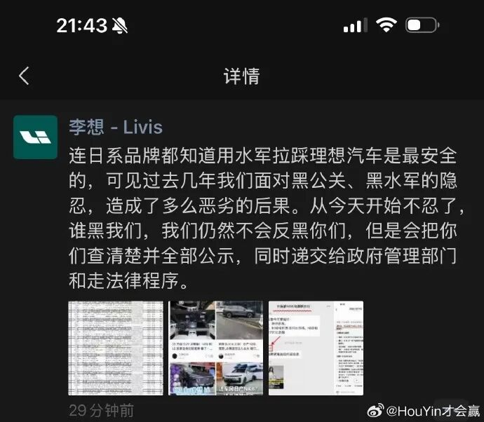 李想說,從今天開始不忍了。不反黑,但所有證據(jù)都會公示,全部走法律程序。