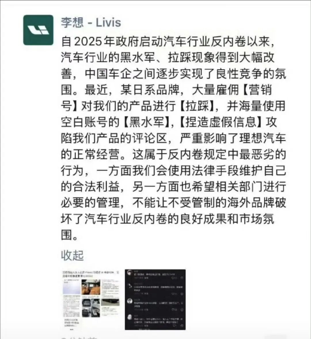 所以李想說的一句話,是這次事件的點(diǎn)睛之筆:“連日系品牌都知道,用水軍拉踩理想汽車是最安全的。”