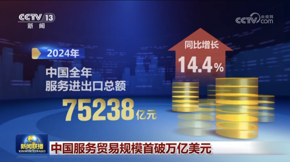 2024年,中國服務進出口總額首次突破1萬億美元(7.5萬億元人民幣)。