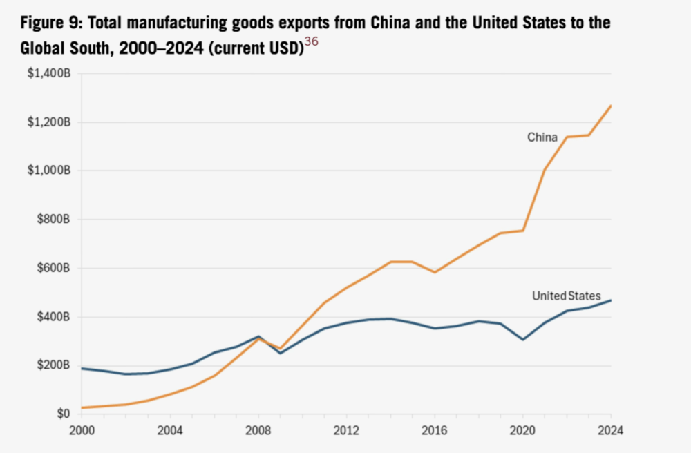 21世紀初以來,中國對發(fā)展中國家的制造與技術出口增長44倍,而美國僅增長2.5倍。