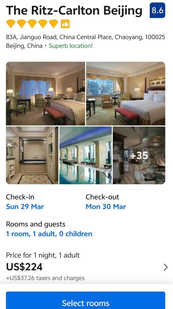 不久前,美國(guó)朋友Mike通過(guò)WhatsApp給我發(fā)來(lái)一張酒店預(yù)訂截圖,顯示北京麗思卡爾頓酒店一晚250美元還包含早餐。