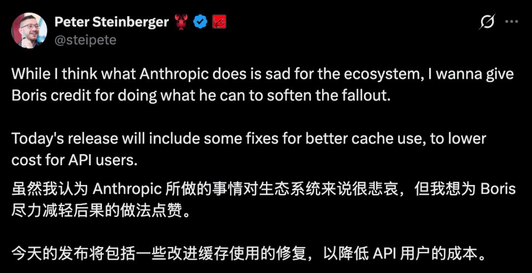 另一件讓Boris出圈的事帶點“樂子人”屬性:Claude封殺OpenClaw后,他火速化身公關,在社交平臺安撫用戶、答疑解惑到深夜11點,連“龍蝦之父”Peter Steinberger都為他點贊。