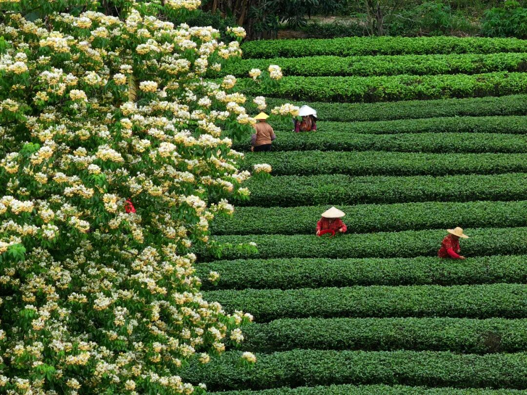 水步茶園中,采茶工人在茶壟間忙碌穿梭。陳舜杰/攝