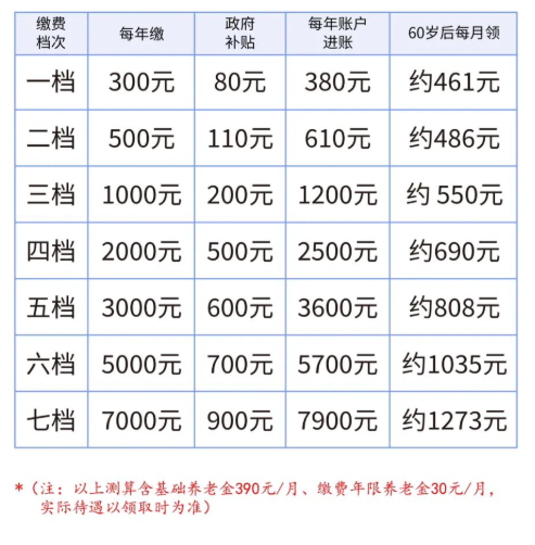 選擇5000元檔比3000元檔,每年多繳2000元,政府多補(bǔ)100元,60歲后每月多領(lǐng)227元,一年合計(jì)2724元;選擇7000元檔比5000元檔,每年多繳2000元,政府多補(bǔ)200元,60歲后每月多領(lǐng)238元,一年合計(jì)2856元。顯然,多繳多得、多補(bǔ)多領(lǐng),這筆賬十分劃算!