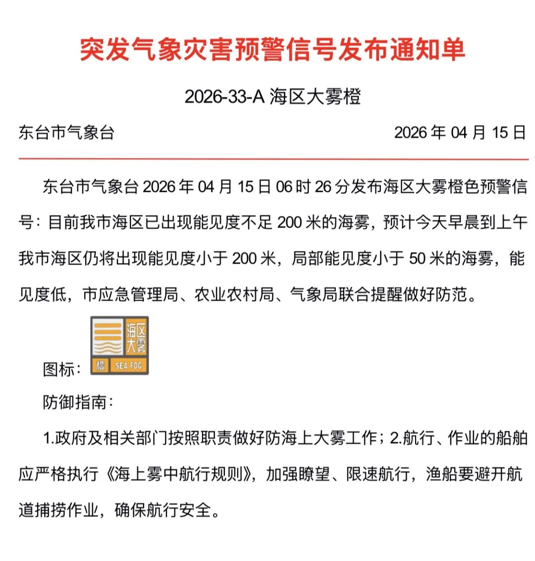 東臺(tái)市氣象臺(tái)在2026年4月15日6時(shí)26分發(fā)布了海區(qū)大霧橙色預(yù)警信號(hào)。當(dāng)前,我市海區(qū)已出現(xiàn)能見(jiàn)度不足200米的海霧,預(yù)計(jì)今天早晨到上午,該區(qū)域仍會(huì)有能見(jiàn)度小于200米的海霧,局部能見(jiàn)度甚至可能低于50米。鑒于能見(jiàn)度低的情況,市應(yīng)急管理局、農(nóng)業(yè)農(nóng)村局和氣象局再次聯(lián)合提醒,務(wù)必做好防范措施。