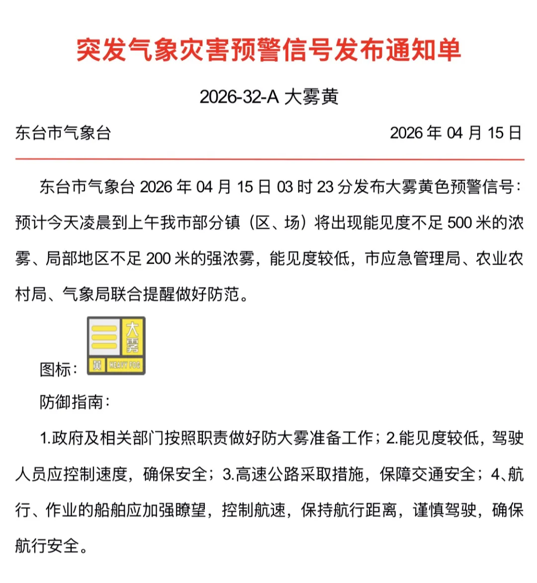 東臺(tái)市氣象臺(tái)于2026年4月15日3時(shí)23分發(fā)布大霧黃色預(yù)警信號(hào)。根據(jù)預(yù)報(bào),今天凌晨至上午,我市部分鎮(zhèn)(區(qū)、場(chǎng))會(huì)出現(xiàn)能見(jiàn)度不足500米的濃霧,局部區(qū)域能見(jiàn)度甚至低于200米,屬于強(qiáng)濃霧范疇。由于能見(jiàn)度較低,市應(yīng)急管理局、農(nóng)業(yè)農(nóng)村局與氣象局聯(lián)合發(fā)出提醒,呼吁相關(guān)方面做好防范工作。