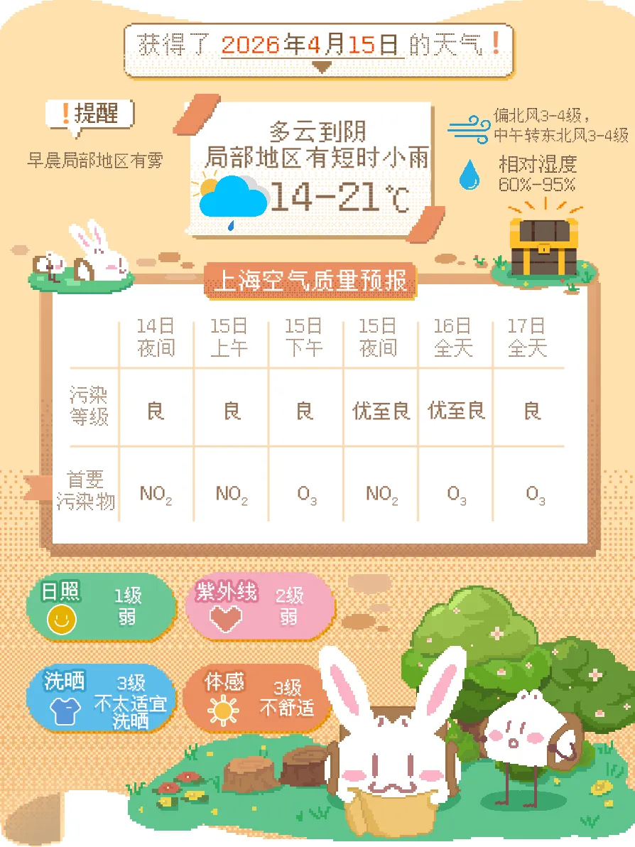 昨夜到今晨,部分郊區(qū)出現(xiàn)了大霧天氣,預計今天(4月15日)上午之前局部區(qū)域仍會有霧,大家出行時要留意道路交通安全。今天白天降雨較弱,天氣以多云到陰天為主,局部地區(qū)可能有短時小雨,在雨水停歇的間隙,陽光會短暫出現(xiàn)。風向方面,上午是偏北風3~4級,中午起轉為東到東北風3~4級。今日氣溫在14~21℃之間,相對濕度為95%~60%。