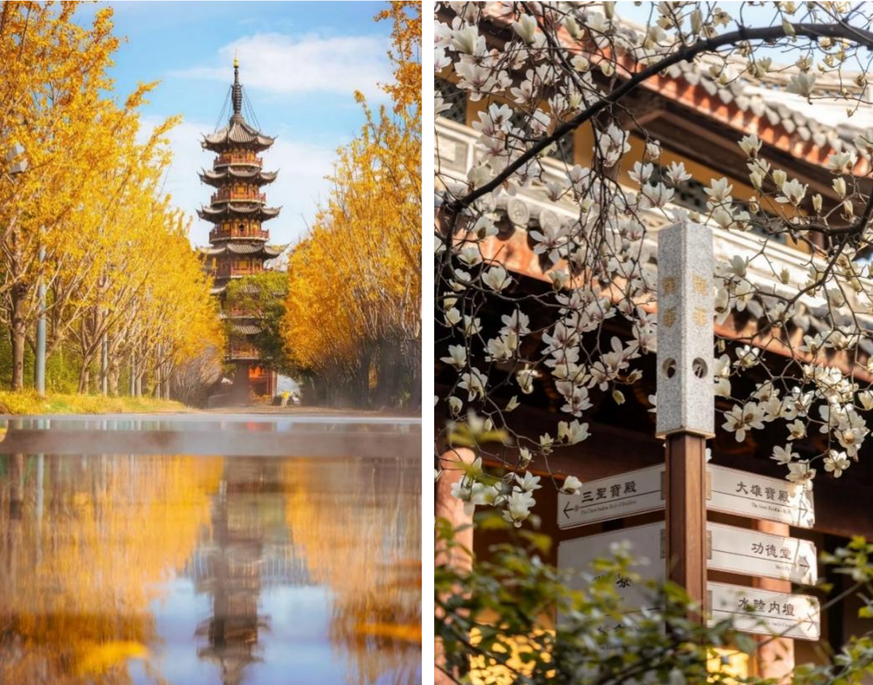 左:冬季,龍華寺1700年銀杏樹景;右:春季,龍華寺300年玉蘭樹景