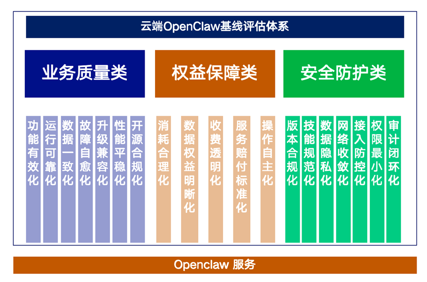 云端OpenClaw基線評(píng)估以業(yè)務(wù)質(zhì)量、權(quán)益保障、安全防護(hù)為核心治理維度,構(gòu)建包含三大維度、百余項(xiàng)指標(biāo)的評(píng)估體系,為云端OpenClaw提供從版本、權(quán)限、網(wǎng)絡(luò)到技能、數(shù)據(jù)、審計(jì)的統(tǒng)一可信基礎(chǔ)。