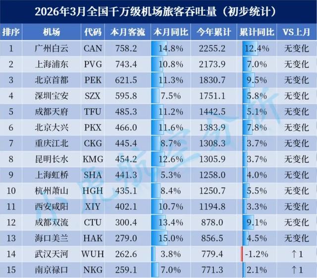 今年一季度,廣州白云國(guó)際機(jī)場(chǎng)旅客吞吐量達(dá)2255萬(wàn)人次,同比增長(zhǎng)12.4%,反超上海浦東機(jī)場(chǎng)的2173萬(wàn)人次,重新登頂。