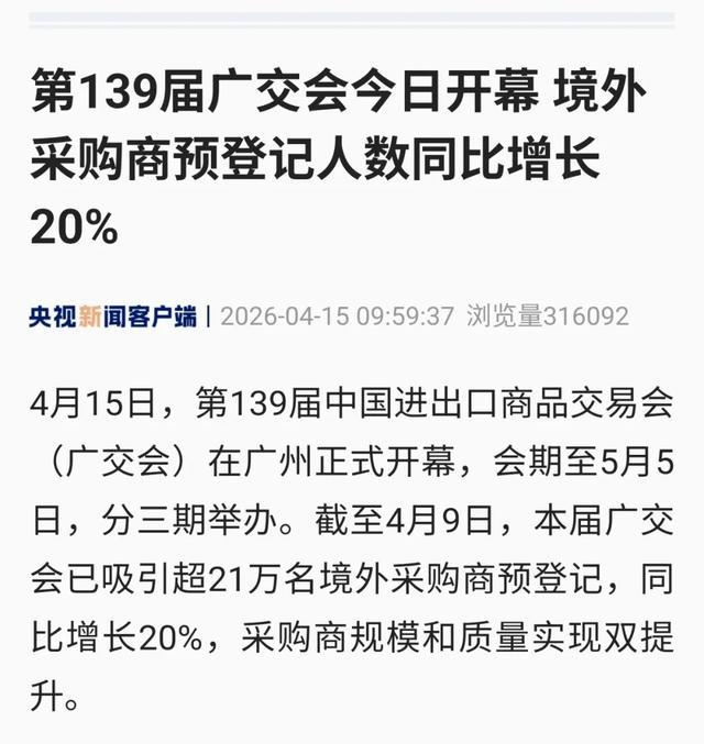 近日,2026年春季廣交會(huì)正式拉開(kāi)帷幕,此次展會(huì)展位總數(shù)達(dá)7.57萬(wàn)個(gè),參展企業(yè)突破3.2萬(wàn)家,兩項(xiàng)數(shù)據(jù)均刷新往屆紀(jì)錄,更有超20萬(wàn)名境外采購(gòu)商完成預(yù)注冊(cè),同比增長(zhǎng)20%。