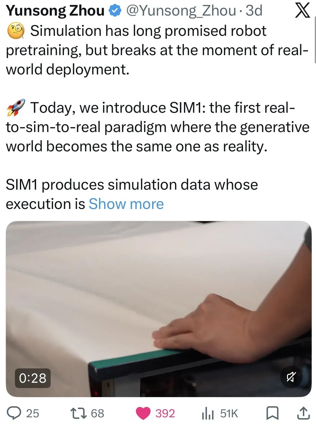 具身智能發(fā)展迅速,但瓶頸日益明顯:并非模型不夠大,而是高質(zhì)量、可執(zhí)行、可泛化的數(shù)據(jù)匱乏。柔體操作更是數(shù)據(jù)稀缺的重災(zāi)區(qū),其狀態(tài)空間龐大,涉及形變、接觸和拓?fù)渥兓?,依賴?fù)雜物理過程;人工遙操作效率低、成本高,導(dǎo)致真實(shí)數(shù)據(jù)始終“夠用卻不足夠多”。在此背景下,SIM1聚焦的核心問題并非“能否生成更多仿真數(shù)據(jù)”,而是“數(shù)據(jù)需先準(zhǔn)確,數(shù)據(jù)擴(kuò)增的價(jià)值才能真正體現(xiàn)”。