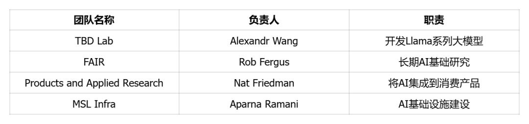 2025年8月,Meta Superintelligence Labs進(jìn)一步重組為四個(gè)子團(tuán)隊(duì):