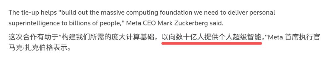 扎克伯格在聲明中明確表示:此次合作將助力我們搭建大規(guī)模計(jì)算基礎(chǔ)設(shè)施,為數(shù)十億人提供個(gè)人超級(jí)智能!