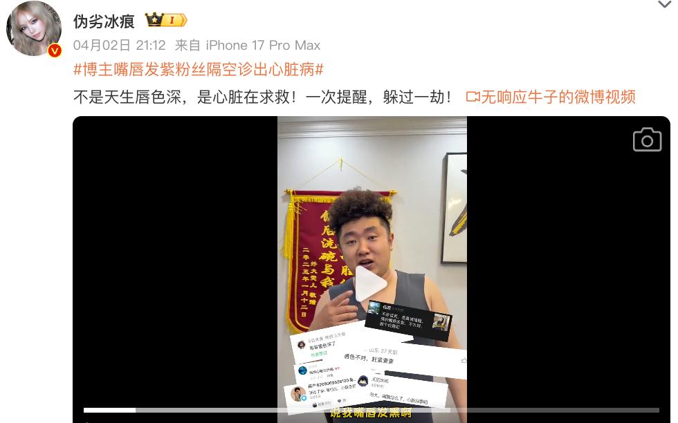 博主稱經(jīng)粉絲提醒發(fā)現(xiàn)心臟病 | 微博@偽劣冰痕