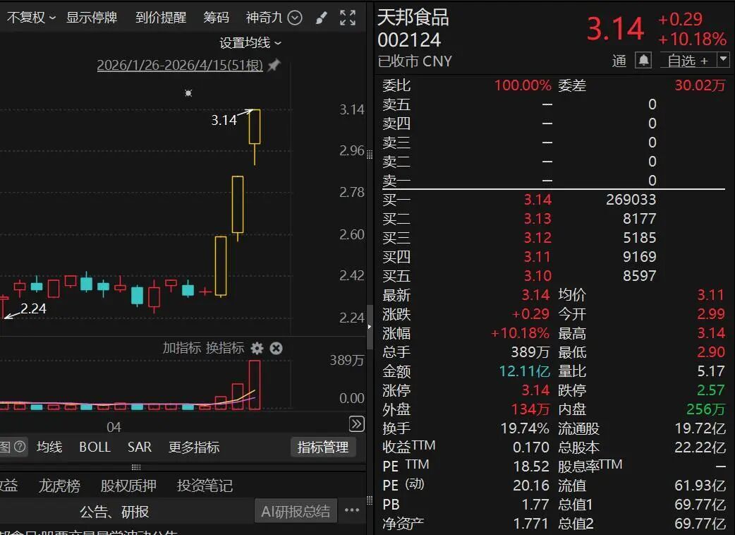 4月15日,天邦食品(002124)收獲連續(xù)第三個漲停板。當(dāng)日收盤,其股價報3.14元,較前一交易日上漲0.29元,漲幅達(dá)10.18%。