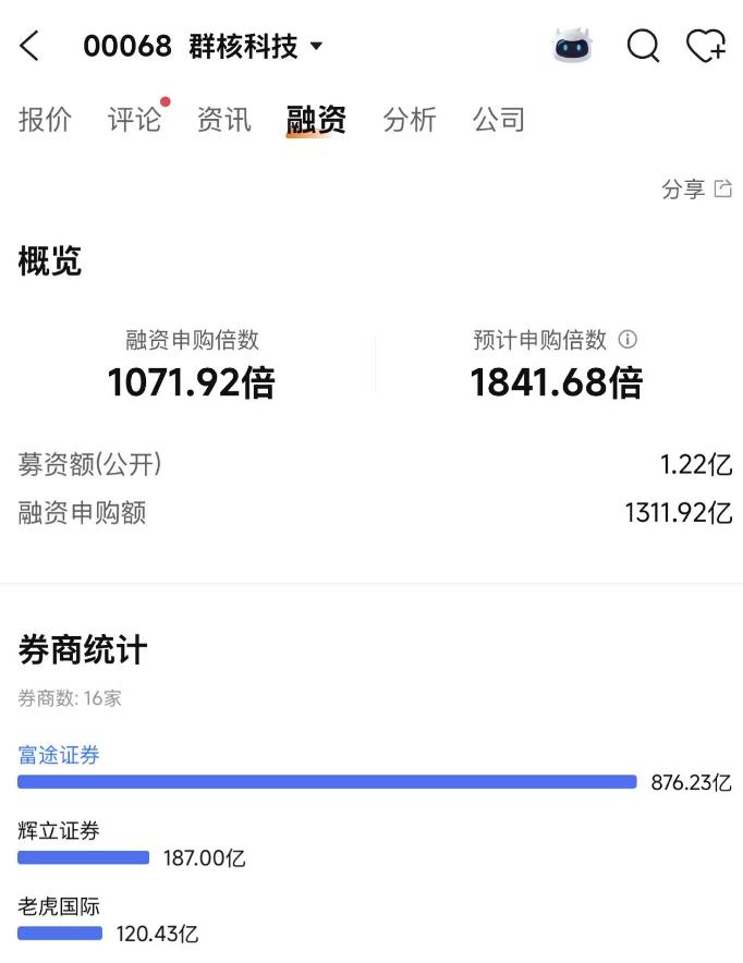富途證券的數(shù)據(jù)顯示,此次香港公開發(fā)售部分超額認購倍數(shù)超1071倍,募資額達1.22億港元,融資申購額更是高達1311億港元,市場對這家明星科技公司的追捧程度由此可見。不過該數(shù)據(jù)目前僅為券商統(tǒng)計數(shù)據(jù)。