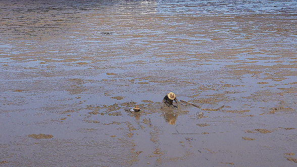 實(shí)驗(yàn)者B則將泡沫板平鋪在身前泥面,然后緩慢俯身趴上,利用泡沫板匍匐移動(dòng),同時(shí)用趕海的小鏟子清理身邊淤泥。