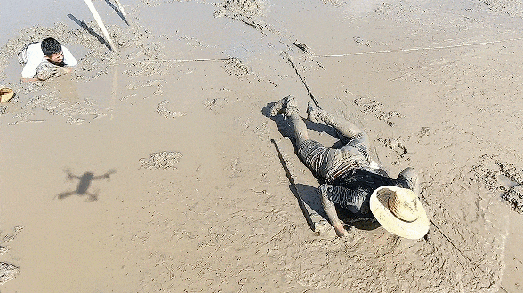 兩位實(shí)驗(yàn)者模擬陷入淤泥至腰部,使用灘涂附近的常見物自救。實(shí)驗(yàn)者A將空塑料桶緊抱胸前并壓在身下,利用浮力托住身體,防止繼續(xù)下陷,隨后他又借助身旁的長(zhǎng)桿,從淤泥中爬了出來(lái),繼續(xù)抱著空塑料桶向前爬行自救。