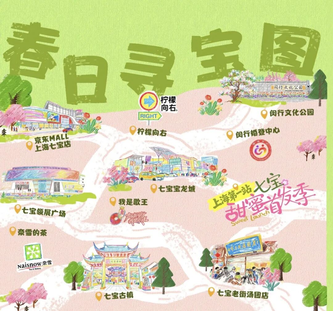 本次活動核心互動載體《春日尋寶圖》,4月25日起,居民和游客可在七寶古鎮(zhèn)鐘樓文創(chuàng)店、七寶寶龍城服務(wù)臺、七寶領(lǐng)展廣場服務(wù)臺、閔行文化公園甜蜜市集內(nèi)的七寶老街咖啡郵局?jǐn)偽唬ㄊ屑瘍H周末及節(jié)假日開放)這四個點(diǎn)位免費(fèi)領(lǐng)取。有了它,就能在千年古鎮(zhèn)與現(xiàn)代商圈間穿梭,體驗(yàn)“敲愿鐘、吃湯團(tuán)、拍甜照”的七寶“三件套”,開啟一場兼具國際范與煙火氣的春日消費(fèi)盛宴。