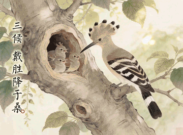 戴勝鳥(niǎo)會(huì)降落在桑樹(shù)上。戴勝鳥(niǎo)頭部有類(lèi)似“勝”的羽毛,此時(shí)常停留在桑樹(shù)上,因?yàn)樾Q即將孵化。“降”字體現(xiàn)了戴勝鳥(niǎo)仿佛從天而降的姿態(tài),這也是節(jié)氣之氣作用的結(jié)果。