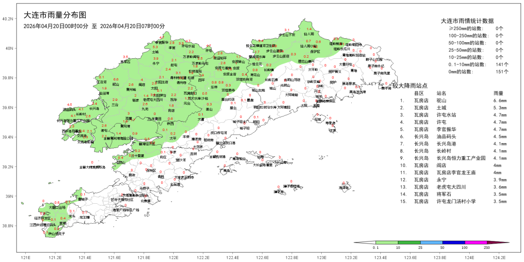 4月20日0時至7時,我市部分區(qū)域出現(xiàn)小雨(詳見附圖)。全市平均降雨量達0.8毫米,其中瓦房店駝山降雨量最大,為6.6毫米;瓦房店許屯1小時最大降雨量為3.1毫米。當(dāng)前降雨已結(jié)束。